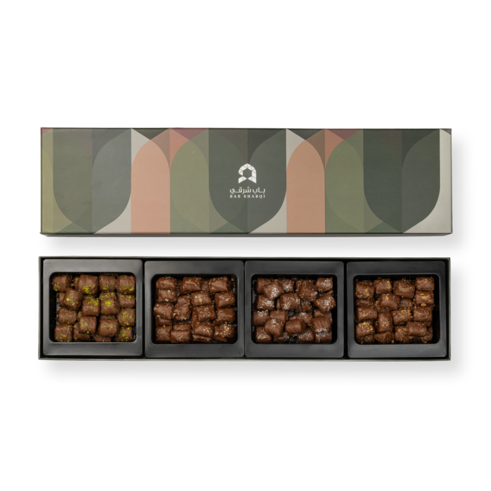 طبقات الجلاش الهشة، الغنية بالحشوات الاستثنائية (البيكان مع الكراميل المملح، اللوز مع الكراميل المملح، الفستق، وجوز الهند)، والمغطاة بالشوكولاتة البلجيكية.